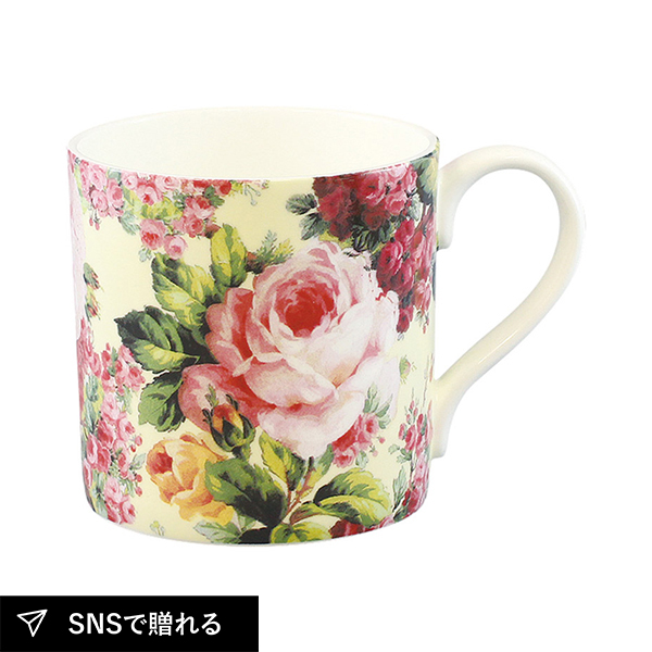 カジュアルで優雅なオールドローズデザインのエインズレイ マグ。電子レンジ・食洗機対応で毎日のティータイムを華やかに彩ります。大切な方への贈り物や、自宅での特別なひとときにぴったりの逸品です。