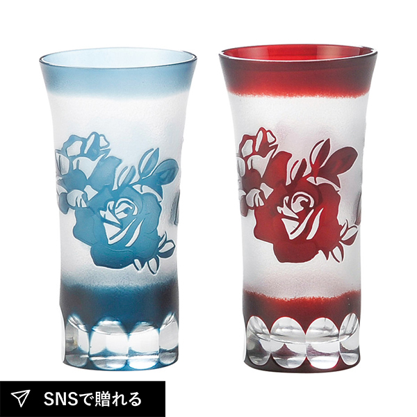 バラの柄が印象的な青と赤の切子です。特別なお祝いやおもてなしにも使えて日常使いもできる、これ1つで食卓がパッと華やかになるアイテム。お酒好きな方へ贈るちょっとしたプレゼントにもおすすめです。