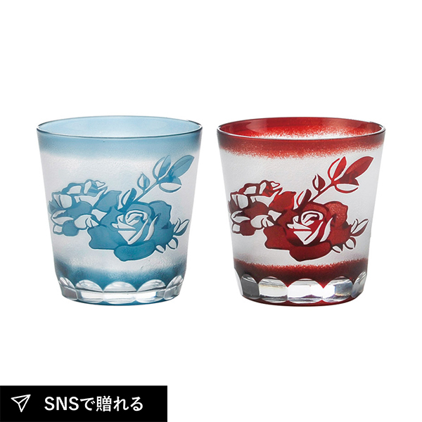 バラの柄が印象的な青と赤の切子です。特別なお祝いやおもてなしにも使えて日常使いもできる、これ1つで食卓がパッと華やかになるアイテム。お酒好きな方へ贈るちょっとしたプレゼントにもおすすめです。