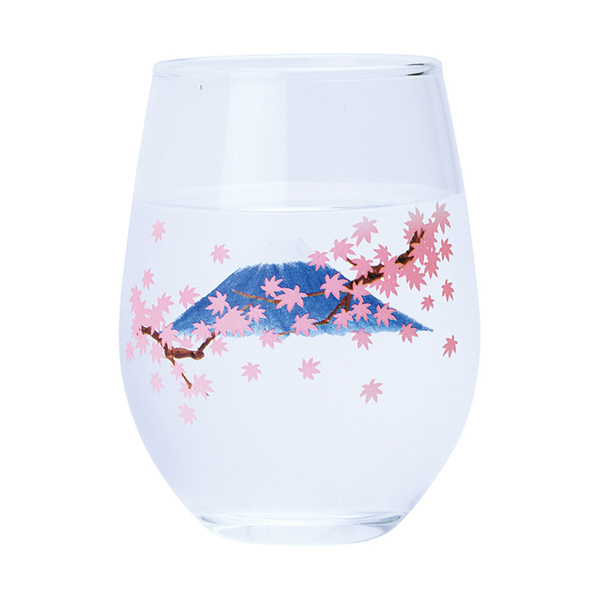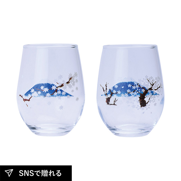 注ぐ冷水で色が鮮やかに変わる富士桜・富士紅葉デザインのグラスペア。340mlの使いやすいサイズで、飲む楽しさを演出します。四季を感じさせる美しい色彩と遊び心あるデザインが、日常のテーブルを華やかにし、ギフトにもぴったりのセットです。