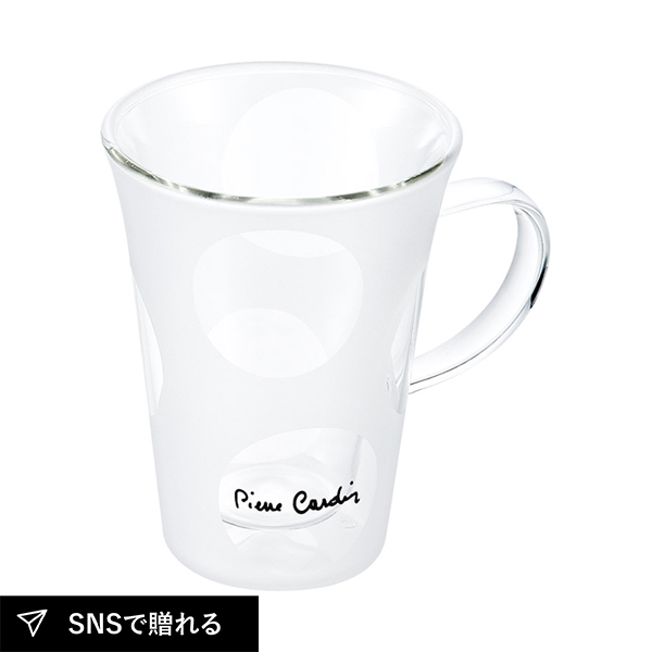 2重構造で保温・保冷効果が抜群です。コーヒーや紅茶、ジュースなど、ご自宅でティータイムを楽しむのにぴったり。外面にはブラストで表現した大きな水玉模様が入っていてキュート!電子レンジも使えて便利なガラスマグカップです。カルダン氏のサイン文字が入っています。