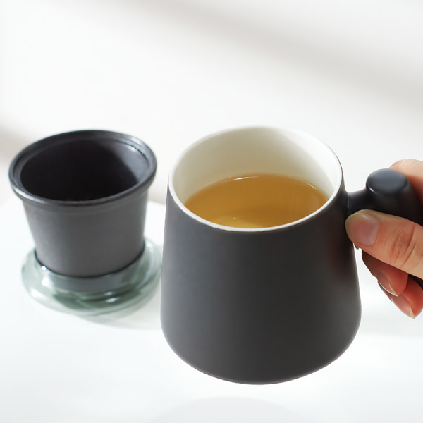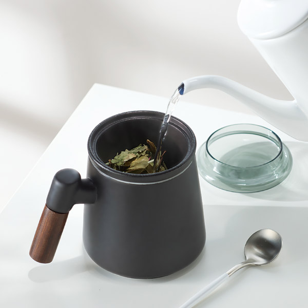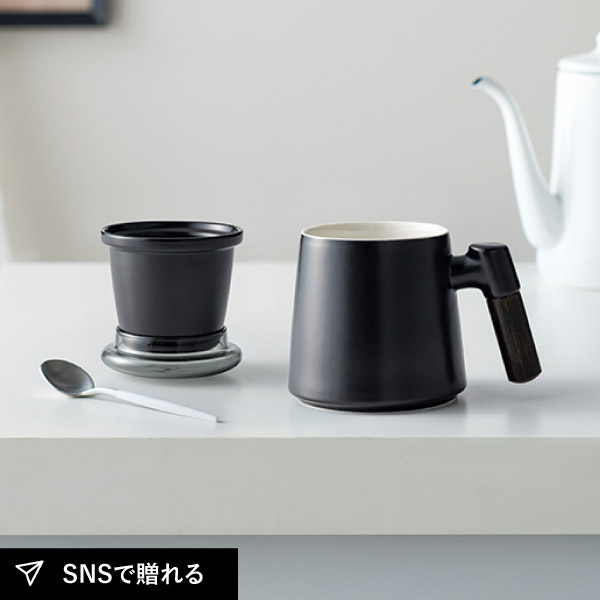 木目の美しい取っ手に、細かい梨地の磁器が重厚感を感じさせるマグカップ。スモーキーな色合いの耐熱ガラス製の蓋を合わせたティーストレーナー付きマグカップはティーポットがなくてもお茶が楽しめる機能性と、異素材が絶妙にミックスされた格好良さを併せ持っています。