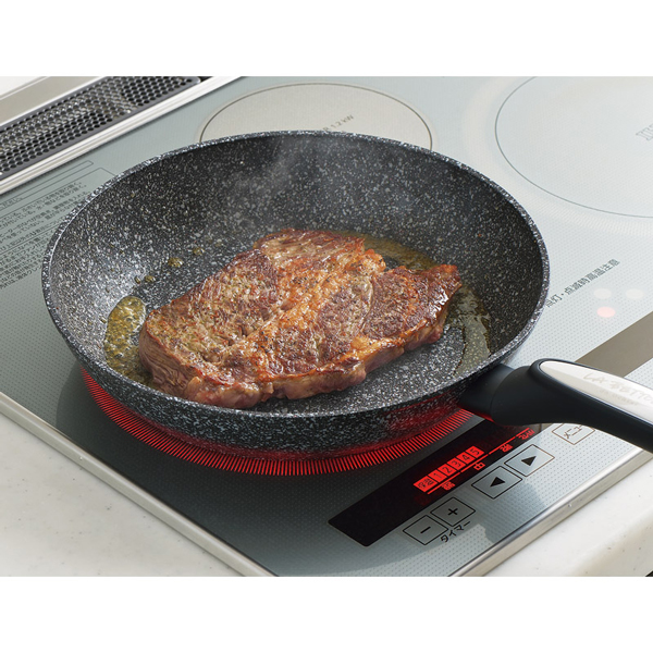 ブラックのベースコートにシルバーと赤のマーブル模様を散りばめて…4層マーブルフッ素で焦げ付きにくさが長持ちします。耐摩耗テスト100万回クリア!!少量の炒め物に活躍する、小回りのきくサイズ。朝食やお弁当作りにも便利です。