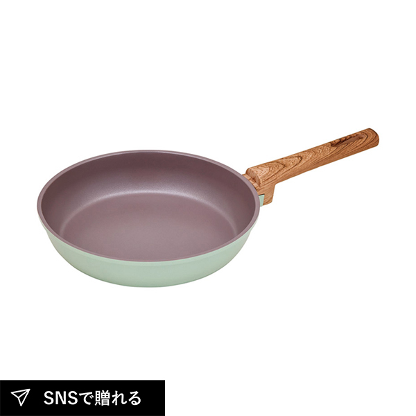 さわやかなくすみグリーンで、キッチンを鮮やかに彩ります。こびりつきにくいダイヤモンドコート加工。接合部分にリベット(留め具)がない為、洗いやすいです。軽量なアルミダイカストを採用。強度に優れ、熱伝導率が高いため、素早く調理できます。PFOA・PFOS不使用。レシピブック付。