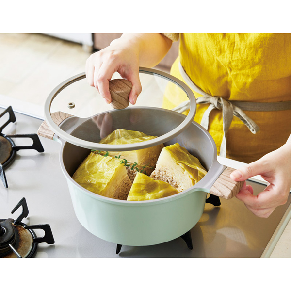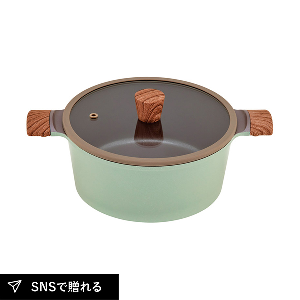 さわやかなくすみグリーンで、キッチンを鮮やかに彩ります。こびりつきにくいダイヤモンドコート加工。接合部分にリベット(留め具)がない為、洗いやすいです。軽量なアルミダイカストを採用。強度に優れ、熱伝導率が高いため、素早く調理できます。PFOA・PFOS不使用。レシピブック付。