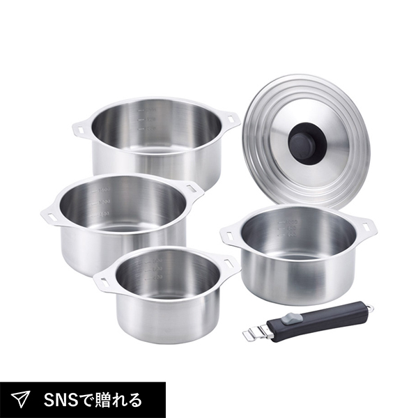 | 鍋14cm(約1.1l)(約155×200×74mm)・鍋16cm(約1.6l)(約175×220×78mm)・鍋18cm(約2.1l)(約195×240×83mm)・鍋20cm(約2.8l)(約215×260×88mm)・兼用蓋・着脱ハンドル×各1 |