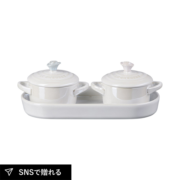 ピンクとブルーのバラがモチーフのツマミがついたプチ・ココットです。トレイにのせて角砂糖やキャンディを入れるキャニスターとして使えば、テーブルがぐっと華やかな印象に。耐熱耐冷に優れておりオーブン調理も可能なので、プリンやカップケーキの型としてもご使用いただけます。