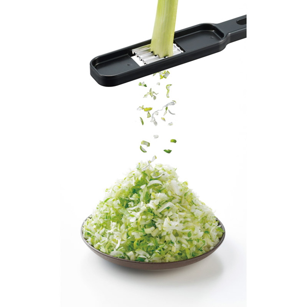 長ネギをいきなりみじん切りにできるスライサーができました。まな板や包丁を出さずに、あっという間にみじん切り。チャーハン、油淋鶏、餃子、麻婆豆腐などの中華料理はもちろん、冷奴や麺類の薬味にも大活躍です。長ネギ専用の安全ホルダー付き。