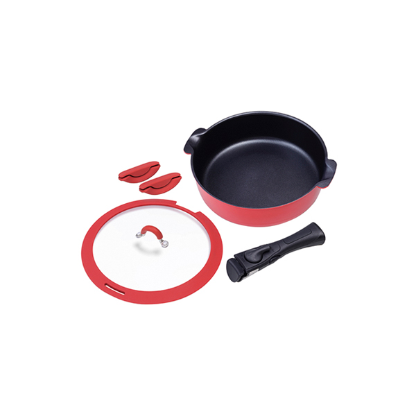 取っ手が取り外せるフライパン兼鍋。内面はこびりつきにくいフッ素樹脂加工でお手入れ簡単。両手卓上鍋や深型フライパンとして使え、着脱ハンドルとシリコーンミトン付きで便利な2WAY調理が可能です。