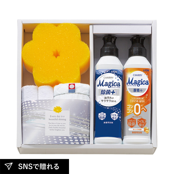 ナノ洗浄で油汚れもサラサラ落とすチャーミーマジカと、今治タオルやマイクロファイバークロスをセットにした、便利で実用的なキッチンギフト。日々の食器洗いを快適にしてくれます。