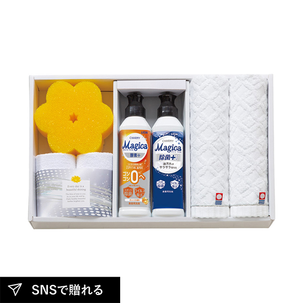 チャーミーマジカオレンジと除菌プラスの洗剤に、タオルやクロス、スポンジを加えた、使いやすいキッチンギフト。毎日の家事を快適に彩ります。贈って喜ばれるキッチン洗剤としておすすめです。