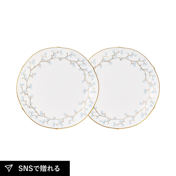 かすみ草をモチーフに白とブルーの花をゴールドで装飾した上品なプレートペア。電子レンジ対応で日常使いもでき、華やかさと実用性を兼ね備えたギフトに最適です。特別な方への贈り物として喜ばれる上質なセットです。