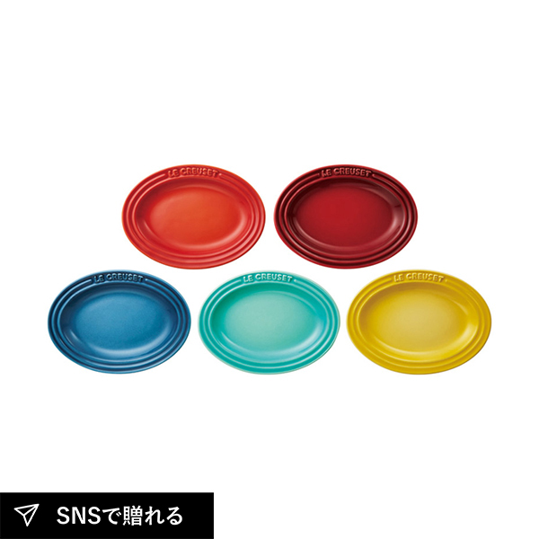 人気の豆皿サイズ、ル・クルーゼ ミニ・オーバル・プレート5枚セット。プチケーキやお茶菓子、和食の小皿としても活躍し、食洗機対応で毎日使える便利さ。可愛らしく実用的なギフトとして喜ばれるセットです。