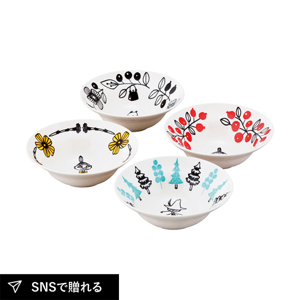 ムーミン谷に住む仲間と豊かな自然を描いたテーブルウェア。モノクロの中にアクセントカラーが入った北欧らしさを感じる大人っぽいデザインなので、大人から子どもまで幅広く使っていただけます。新築祝いや引っ越し祝い、内祝いなどにもおすすめです。