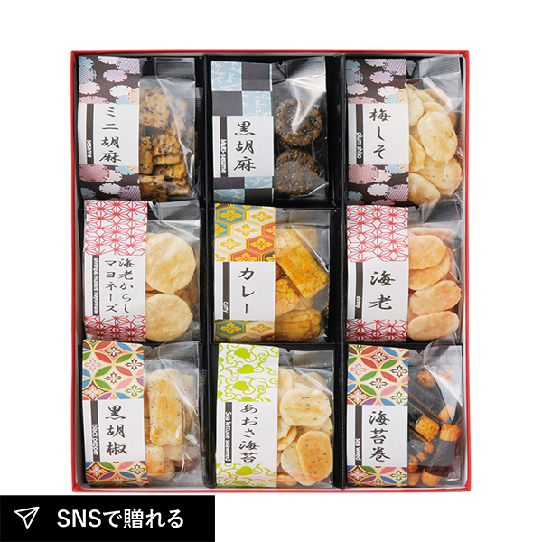 一口サイズのお煎餅詰め合わせです。シンプルな味からカレーなどの洋風味まで、さまざまな種類が一箱に詰まっています。海老、あおさ海苔、黒胡麻、黒胡椒、ミニゴマ、カレー、梅しそ、海老からしマヨネーズ、のり巻きの9種類(各約20g)がそれぞれ1袋ずつ入り、色々な味を少しずつ楽しむことができます。