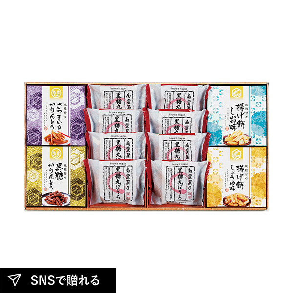 | 黒糖丸ぼうろ×8、揚げ餅(しお味・しょうゆ味)20g・かりんとう(さつまいも・黒糖)40g×各1 |