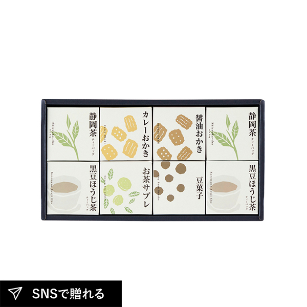 | ティーバッグ(静岡深蒸茶・黒豆ほうじ茶)(2.5g×7P)×各2、お茶サブレ(3本)・たまり醤油おかき24g・カレーおかき24g・豆菓子(黒ごま味)45g×各1 |