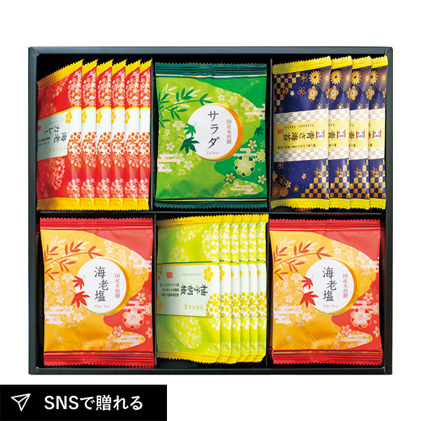 | 海老塩煎餅・柚子胡椒煎餅・海老カレー煎餅×各6、青さ海苔煎餅×4、サラダ煎餅×3 |
