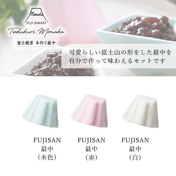 親子で楽しみながら作るのもおすすめです!可愛らしい富士山の形をした最中を自分で作って味わえる最中のセットです。日本が誇る絶景の富士山を思い浮かべながらお召し上がりください。
