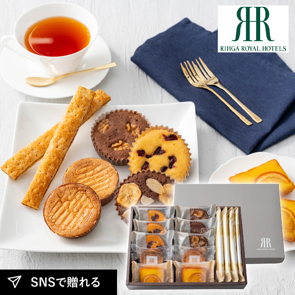 しっとり生地にフルーツやナッツを飾ったプチケーキやオレンジケーキ、さくっとした食感の中にキャラメルの風味が香る少し長いサイズのロングパイ、アーモンドが香ばしく香るフランス伝統の厚焼きクッキーと、ホテルの豊かなティータイムを演出するスイーツを詰め合わせました。