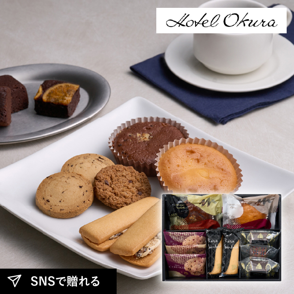 ホテルオークラの焼菓子の詰合せ。チョコレートのほろ苦さを凝縮させたブラウニー、しっとりした焼きあがりのマドレーヌなどさまざまな焼菓子を取り揃えているのにも、選ぶ、味わう楽しさを届けたいというおもてなしの心を感じて頂けるセットとなっています。