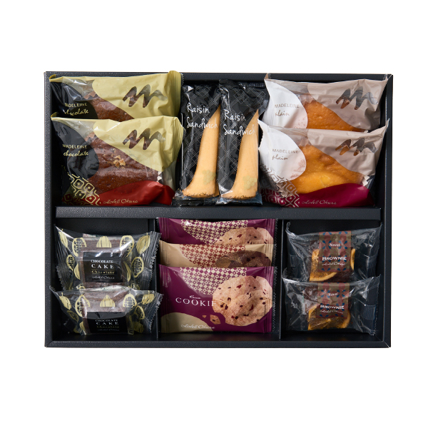 | ブラウニーネーブル・レーズンサンド・マドレーヌ(プレーン・チョコ)・チョコレートケーキ・レーズンクッキー×各2個、チョコチップクッキー×1個 |