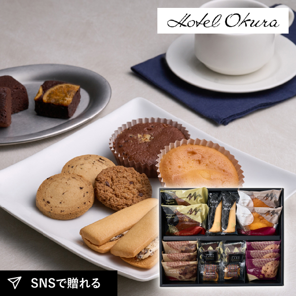 ホテルオークラの焼菓子の詰合せ。チョコレートのほろ苦さを凝縮させたブラウニー、しっとりした焼きあがりのマドレーヌなどさまざまな焼菓子を取り揃えているのにも、選ぶ、味わう楽しさを届けたいというおもてなしの心を感じて頂けるセットとなっています。