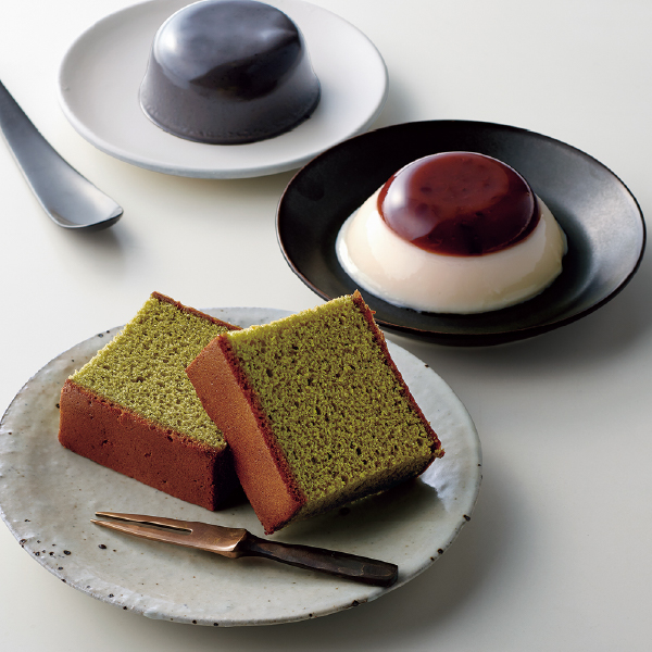 | かすてら抹茶×1本、プリン(あずき・黒ごま×各1個) |