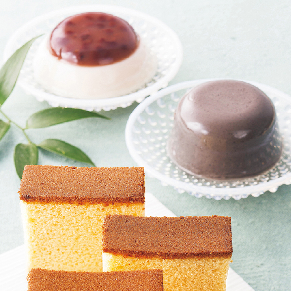 豆乳を生地に使用し、もっちりとした食感に仕上げたかすてらは和三盆糖の上品な甘さが特長の一品。極細に挽いた黒ごまと生クリームで仕上げた黒ごまプリンと、とろとろ食感のあずきプリンをセットで。