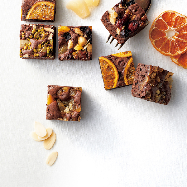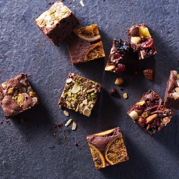 濃厚なチョコレートの生地に、香ばしいナッツや甘酸っぱいフルーツをトッピング。ピスタチオとアーモンド、ごろっとしたパイナップルやネーブル、たっぷりのドライフルーツとナッツ…。おいしさをぎゅっと詰め込んだキューブが、お口に小さなしあわせをお届けします。