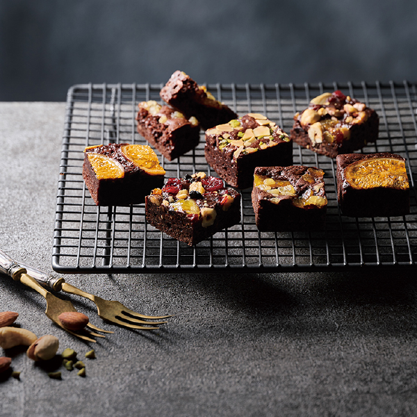 濃厚なチョコレートの生地に、香ばしいナッツや甘酸っぱいフルーツをトッピング。ピスタチオとアーモンド、ごろっとしたパイナップルやネーブル、たっぷりのドライフルーツとナッツ…。おいしさをぎゅっと詰め込んだキューブが、お口に小さなしあわせをお届けします。