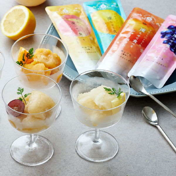 島そだち・瀬戸内レモン・福島のあかつき(白桃)・ピオーネと、日本の豊かな気候で育った国産フルーツ果汁を使用した贅沢なジュレを凍らせて食べるシャーベット。まるでフルーツを食べているかのような濃厚な甘みや爽やかな酸味が口いっぱいに広がります。冷やすとゼリーとして味わえるのも魅力的です。