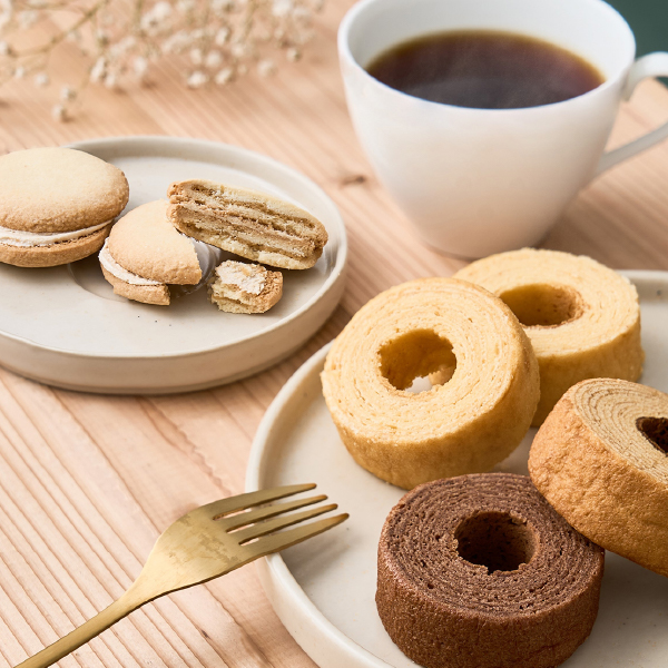 | ふんわりバームクーヘン(ミルク・ココア・黒糖×各2個)、七層のキャラメルサンドクッキー×2個、三喜屋珈琲のレギュラーコーヒー×2袋