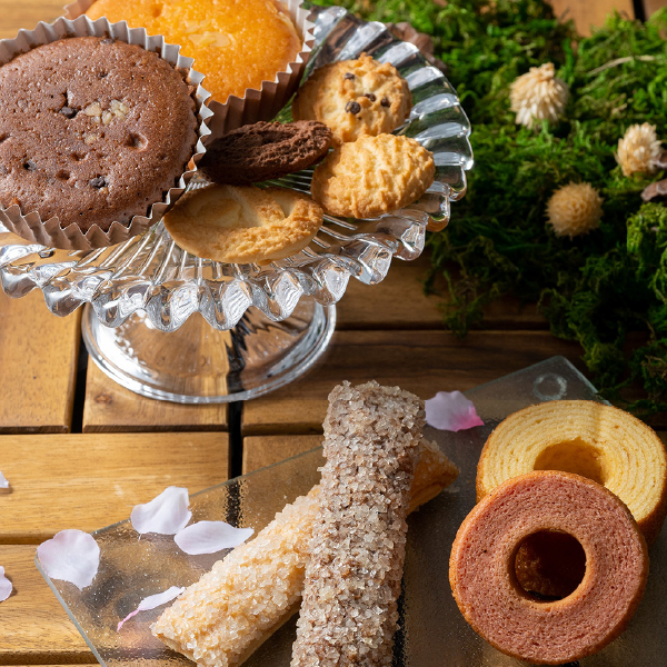 | しっとりバームクーヘン×2、しっとりバームクーヘン苺×1、有精卵たっぷりマドレーヌ(プレーン・ショコラ×各1)、香ばしくて素朴なクッキー(ショコラ×4、ミルク・チョコチップ・メープル×各2)、さくさくスティックパイ(メープル・ショコラ×各3) 合計21個 |