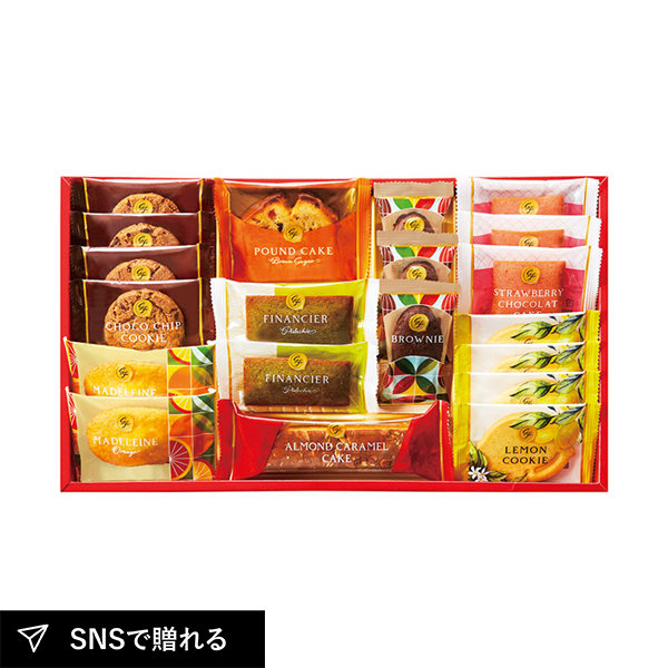 | オレンジマドレーヌ・ピスタチオフィナンシェ×各2、ストロベリーショコラケーキ・ブラウニー×各3、ブラウンシュガーパウンドケーキ・アーモンドキャラメルケーキ×各1、チョコチップクッキー・レモンクッキー×各4 |