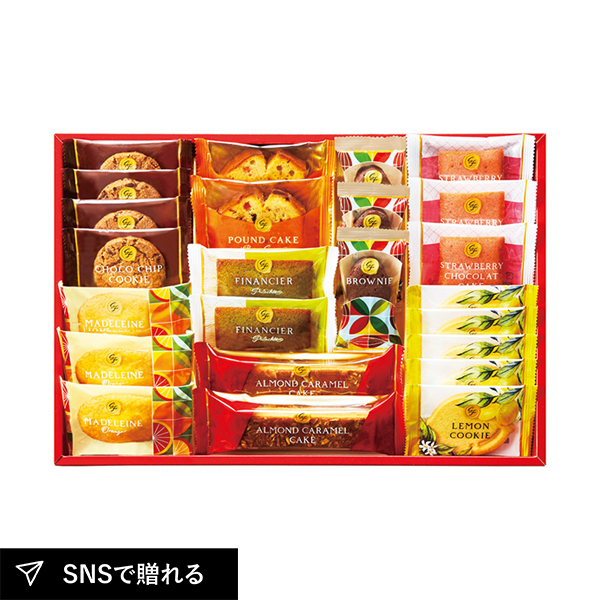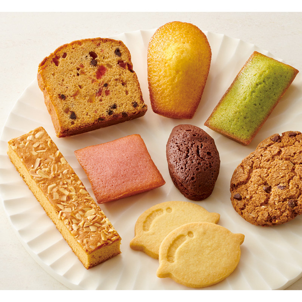| オレンジマドレーヌ・ストロベリーショコラケーキ・ブラウニー×各3、ピスタチオフィナンシェ・ブラウンシュガーパウンドケーキ・アーモンドキャラメルケーキ×各2、チョコチップクッキー×4、レモンクッキー×5 |