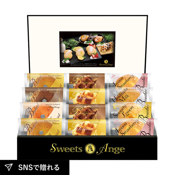 | ベルギーワッフル(プレーン・ショコラ)・ベイクドドーナツ(プレーン)・ブッセ(あまおう苺)×各2、ベイクドドーナツ(ショコラ・ストロベリー)・ブッセ(北海道ミルク・瀬戸内レモン)×各1 |