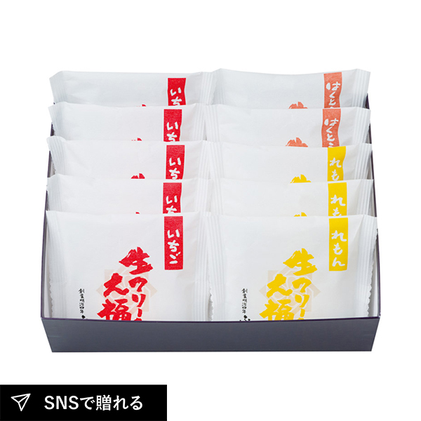 岡山「福井堂」の生クリーム大福セット。ふわっとしたお餅に濃厚な生クリームを包み、贅沢な甘さと滑らかな食感を楽しめます。特別な日の贈答やティータイムに最適な華やかなギフトです。