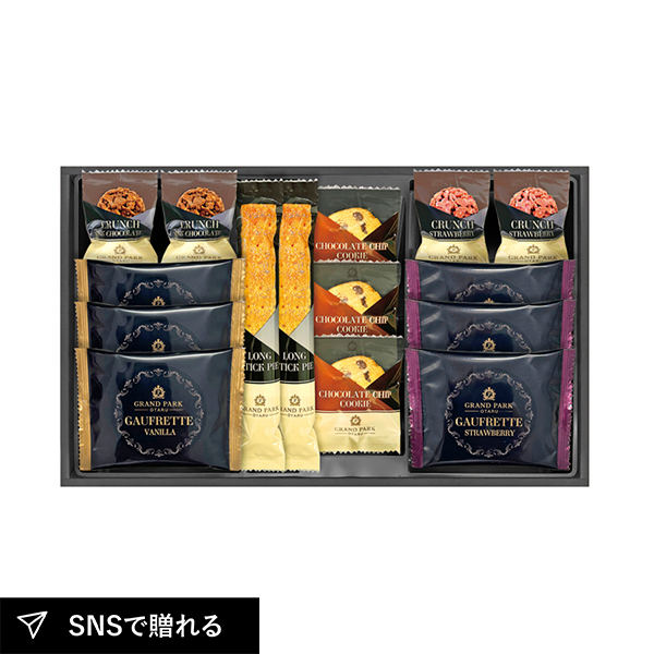 | ロングスティックパイ・チョコクランチ(ミルク・ストロベリー)×各2、ゴーフレット(バニラ・ストロベリー)・チョコチップクッキー×各3 |