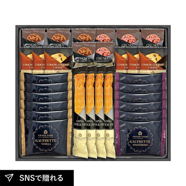 | ロングスティックパイ・チョコクランチ(ミルク・ストロベリー)×各4、ゴーフレット(バニラ・ストロベリー)・チョコチップクッキー×各6 |
