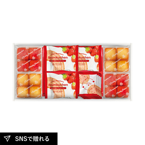 | あまおう苺バウムクーヘン×3、プチフィナンシェ4個入(あまおう苺・プレーン)×各2、焼きほろろクッキー(イチゴ)×4 |