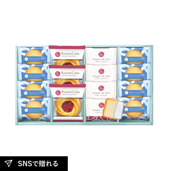 | ロシアケーキブルーベリーサン×3、ラングドシャ×4、チョコインクッキー×8 |