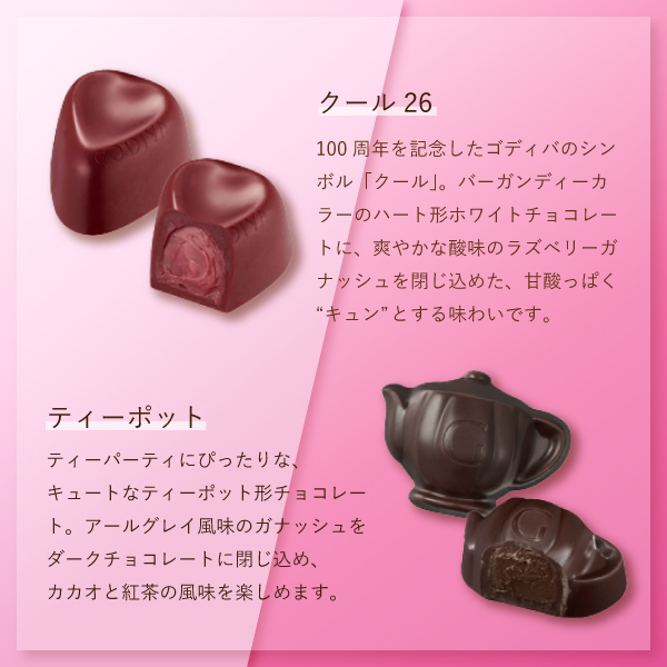「不思議の国のアリス」の印象的なシーン「ティーパーティ」をイメージしたチョコレートを楽しめる、キュートな「アリスのティーパーティ コレクション」。 ティーパーティを彩る紅茶をイメージしたチョコレート、ゴディバの100周年を記念してリニューアルされたハート形のチョコレート、シーズン限定カレを、物語のシンボルのトランプやティーセット、白うさぎなどを描いたパッケージに詰め合わせました。