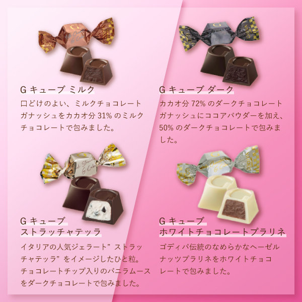 大人かわいいタッチで描かれたチェシャ猫や白うさぎをデザインしたハート形の缶に、ホワイトチョコレートプラリネ、ミルク、ダーク、2026年バレンタインより新登場のダーク ストラッチャテッラのG キューブ チョコレートを詰め合わせました。