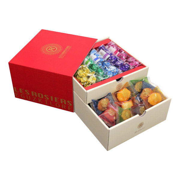 上の段にはフルーツやティラミスなどの5種類のチョコレート。下の段にはフィナンシェやマドレーヌなどの6種類の焼き菓子が。引き出しを開けると、ひと口サイズのカラフルなお菓子がたくさん!華やかなギフトボックスに仕上げました。