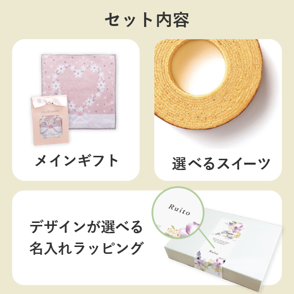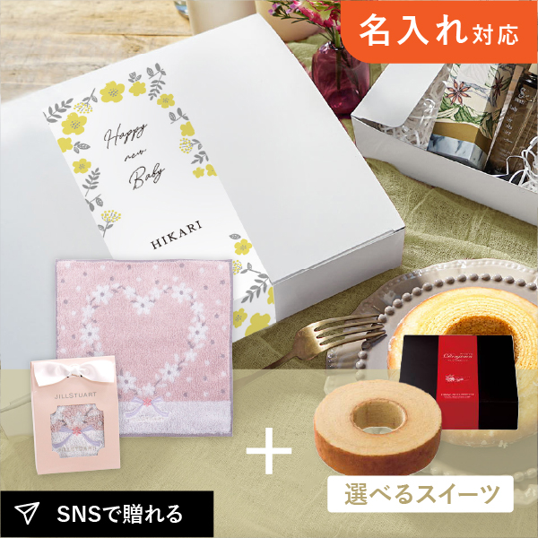 名入れができるラッピングボックスで贈るお礼ギフト。JILLSTUART(ジルスチュアート)のタオルハンカチと人気スイーツを詰め合わせました。生まれたお子様の名前を添えて、赤ちゃんの「初めまして」のご挨拶にぴったりなギフトです。