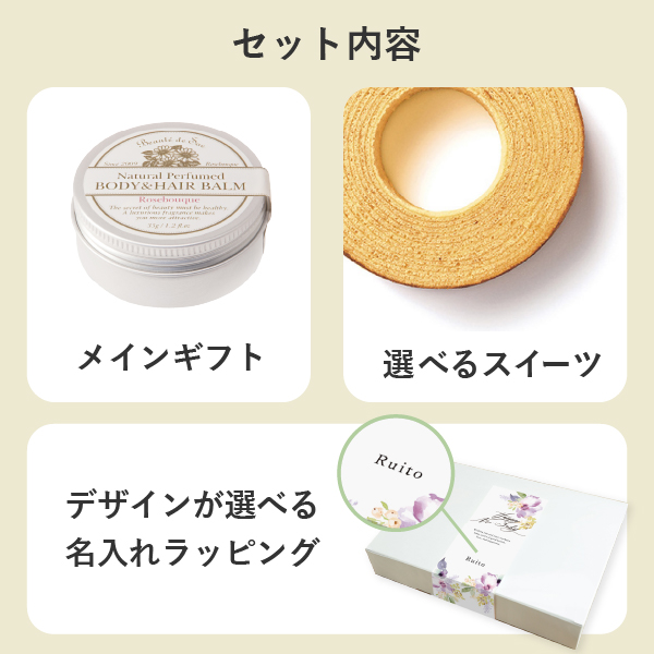 このギフトセットは、人気アイテムと選べるスイーツがセットになっています。専用ボックスシールにはお名前を入れることができて、おしゃれなデザインが特徴です。出産のお祝いや女性への出産内祝いギフトにおすすめしたい商品です。