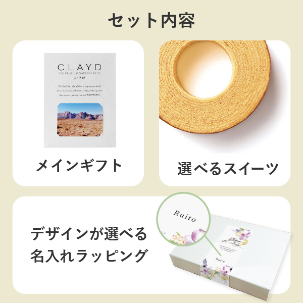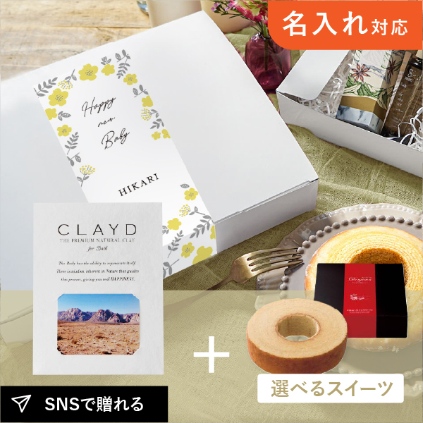 名入れができるラッピングボックスで贈るお礼ギフト。CLAYD(クレイド)と人気スイーツを詰め合わせました。生まれたお子様の名前を添えて、赤ちゃんの「初めまして」のご挨拶にぴったりなギフトです。