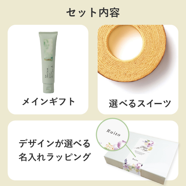 このギフトセットは、人気アイテムと選べるスイーツがセットになっています。専用ボックスシールにはお名前を入れることができて、おしゃれなデザインが特徴です。出産のお祝いや女性への出産内祝いギフトにおすすめしたい商品です。