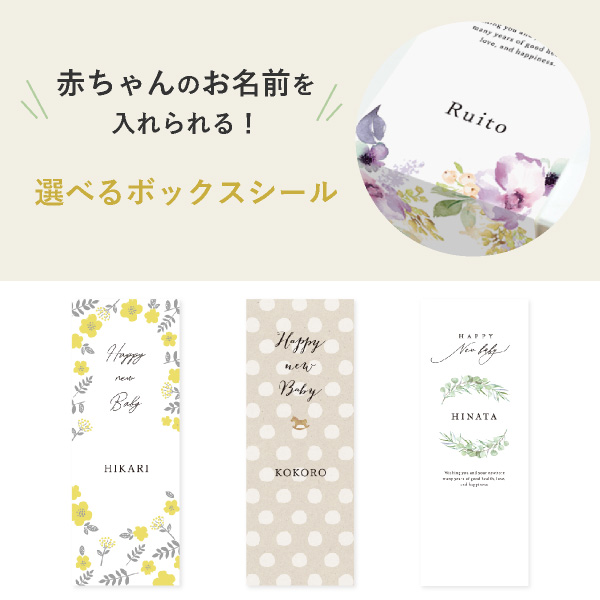 このギフトセットは、人気アイテムと選べるスイーツがセットになっています。専用ボックスシールにはお名前を入れることができて、おしゃれなデザインが特徴です。出産のお祝いや女性への出産内祝いギフトにおすすめしたい商品です。